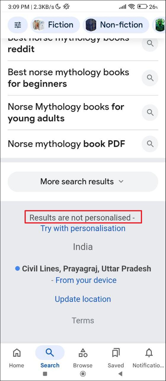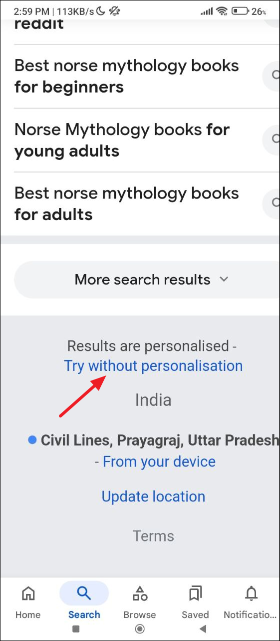 - Scroll down the search results to the bottom and tap on 'Try without personalization'. Now your results will no longer be personalized and you may see results that would otherwise not have been visible.