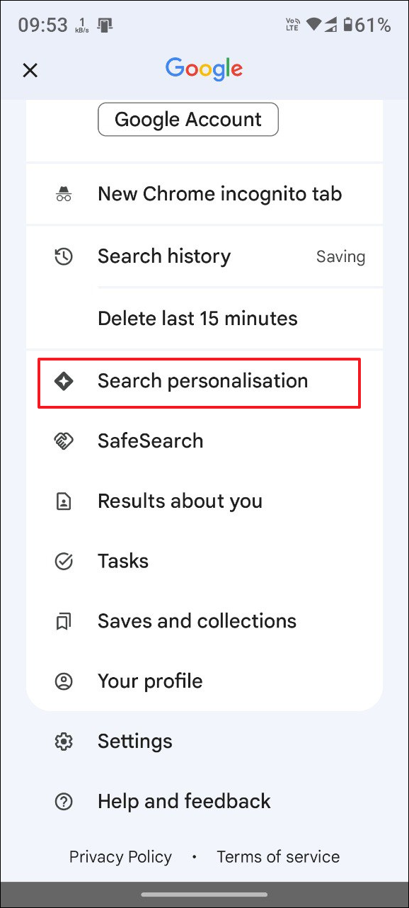 - Tap on 'Search personalization' in the pop-up menu.