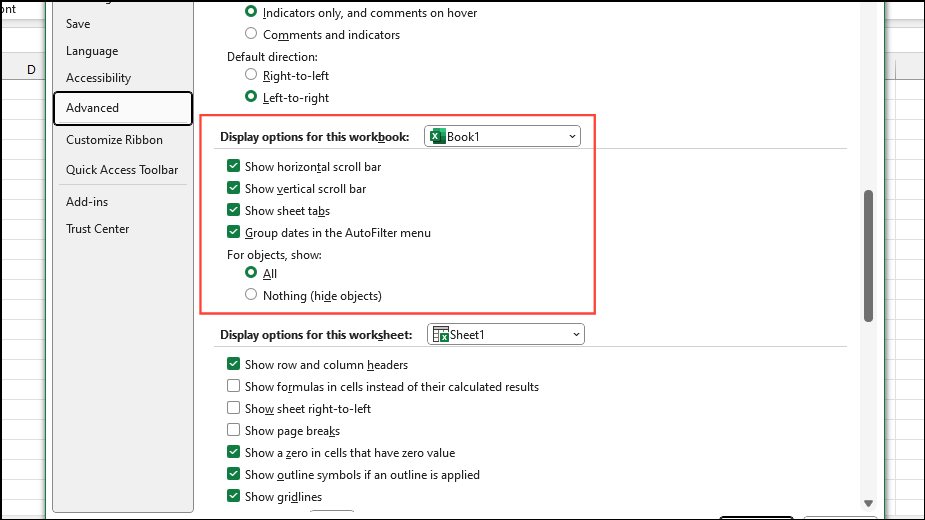 Step 4: Scroll down to the 'Display options for this workbook' section. Ensure that both 'Show horizontal scroll bar' and 'Show vertical scroll bar' are checked.