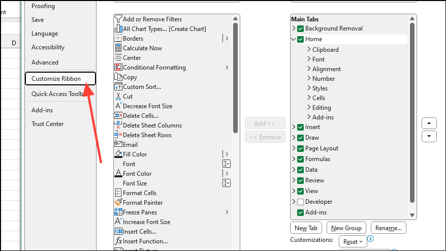 Step 2: In the Excel Options window, choose 'Customize Ribbon' from the left-hand menu.