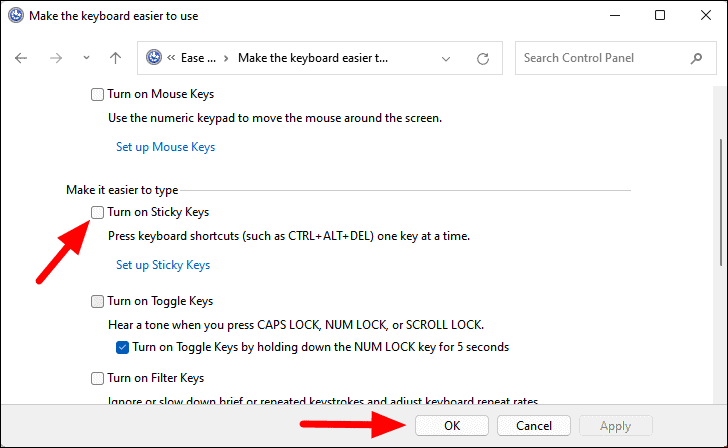 - Uncheck the box next to "Turn on Sticky Keys" and click "OK" to save changes.