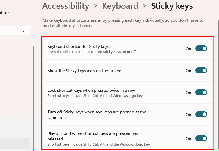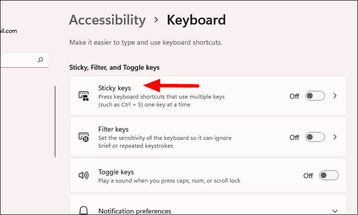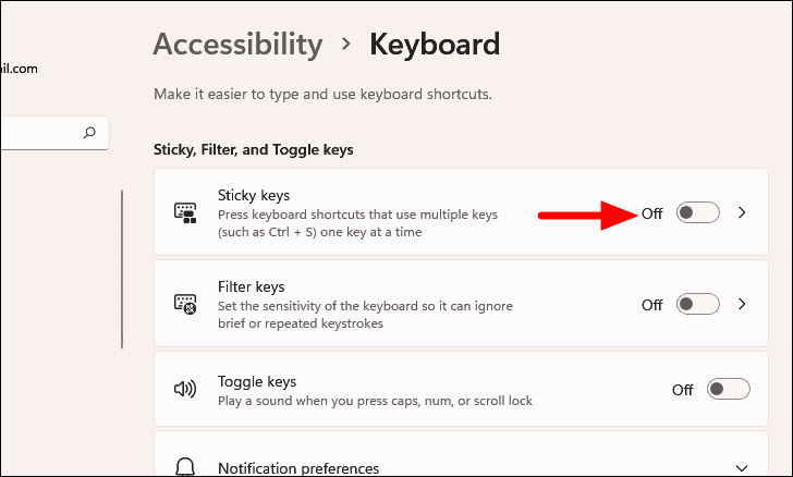 - Locate the "Sticky keys" toggle and switch it to the off position.