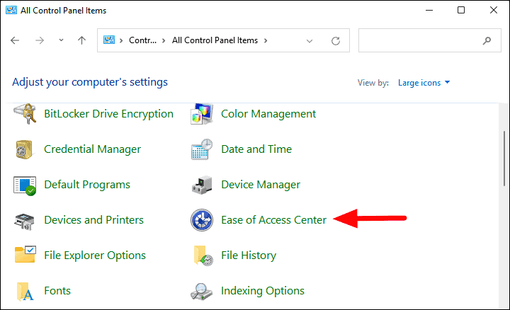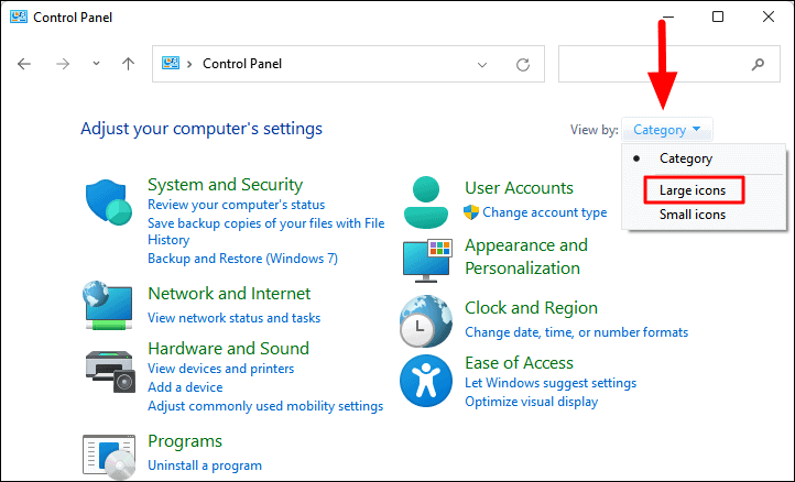 - Change the view to "Large icons" using the dropdown menu in the top-right corner.