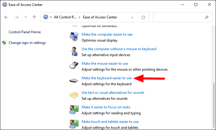- Or use Control Panel > Ease of Access Center > Make the keyboard easier to use and uncheck the Sticky Keys option.