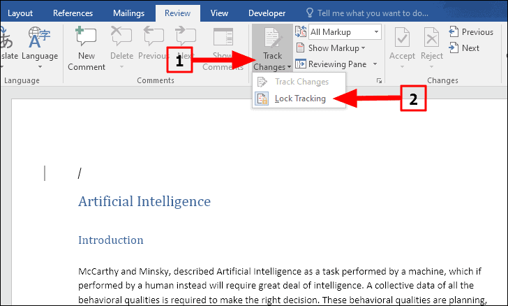 Step 1: In the 'Review' tab, click on the lower part of the 'Track Changes' icon (the part with the arrow) and select 'Lock Tracking' from the dropdown menu.