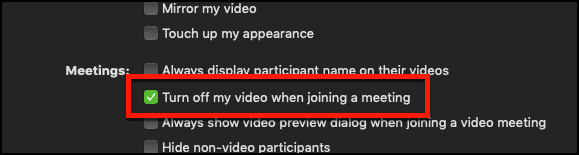 You’d now be seeing a mirroring video of yourself. Scan down to find the ‘Meetings’ section and tick the box next to the second option that says ‘Turn off my video while joining a meeting’ below your video.
