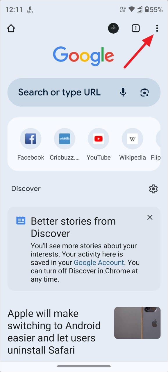 Step 1: Open the Chrome app on your Android device and tap on the three-dot menu icon in the upper-right corner.