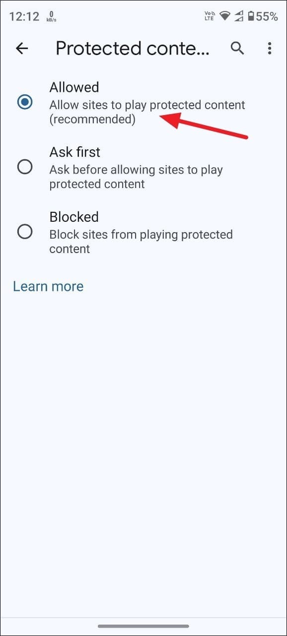 Step 5: On the 'Protected content' page, toggle the switch next to 'Allowed' to enable DRM. Once enabled, you can play protected media content on your Android device.