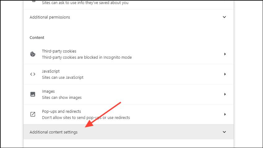 Step 5: At the bottom of the 'Site settings' page, expand the 'Additional content settings' section by clicking on it.