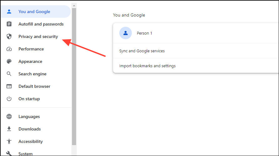 Step 3: In the Settings page, click on 'Privacy and Security' in the left sidebar to access privacy-related options.