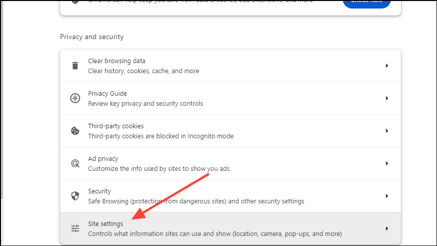 Step 4: Scroll down in the 'Privacy and security' section and click on 'Site Settings' to manage permissions for websites.