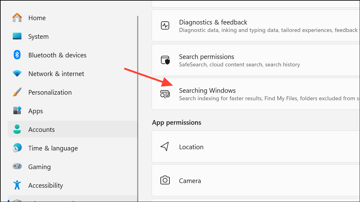 Step 3: On the right, select Searching Windows. Here, you’ll see options that determine how and where Windows indexes your files for search.