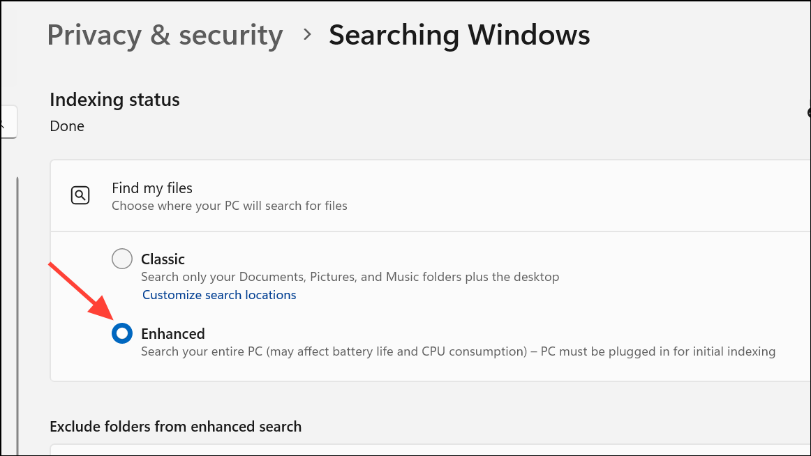 Step 4: Under the Find my files heading, choose the Enhanced option. This instructs Windows to index all user folders and files across your PC, not just the default locations.