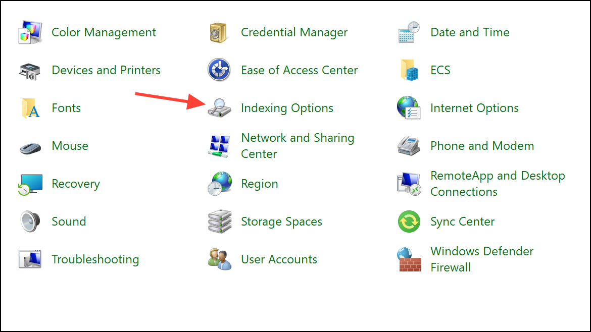 Step 2: Set the “View by” option to Large icons. Click on Indexing Options to access the indexing configuration window.