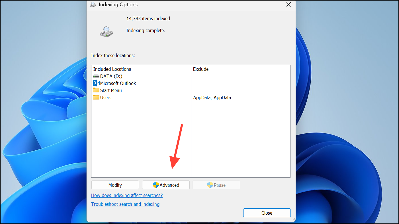 To further refine how Windows indexes files, you can use the advanced options available in the legacy Control Panel: