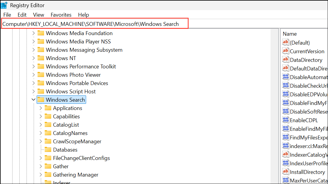 HKEY_LOCAL_MACHINE\SOFTWARE\Microsoft\Windows Search
