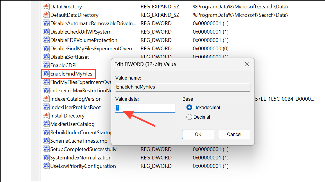 Step 3: Locate the EnableFindMyFiles DWORD value. Set its value to 1 for Enhanced mode or 0 for Classic mode.