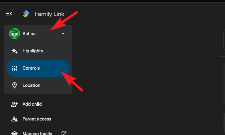 Step 3: In the left sidebar, select your child's account and click on 'Controls'.