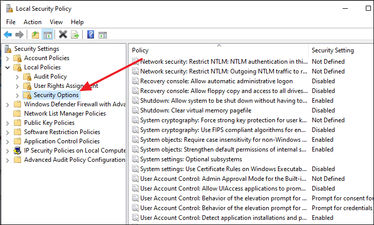 secpol.mscinto the Run dialog and pressEnterto open the Local Security Policy editor. - In the Local Security Policy window, expand Local Policies from the left pane and select Security Options.