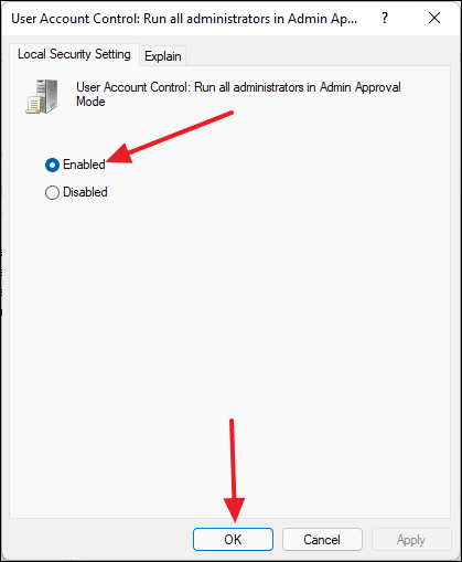 - In the policy properties window, select Enabled and click OK to apply the changes.