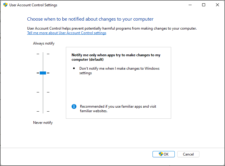 - In the User Account Control Settings window, adjust the slider to choose when to be notified about changes to your computer.