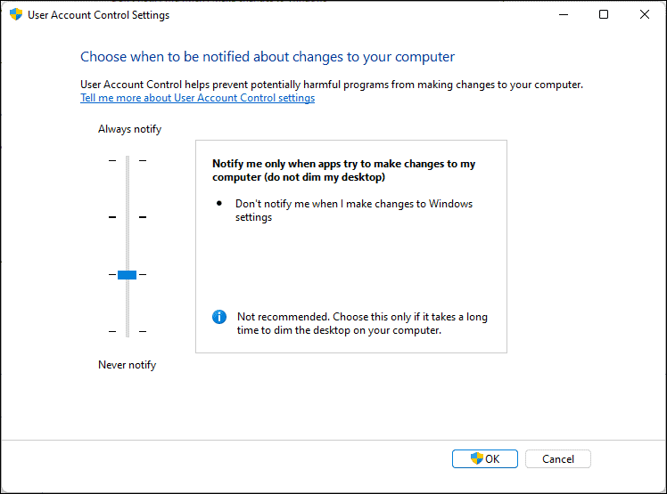 Notify me only when apps try to make changes to my computer (do not dim my desktop): Similar to the default, but your desktop will not be dimmed during prompts. This is less secure because it allows other programs to interfere with the prompt.