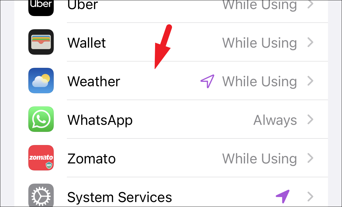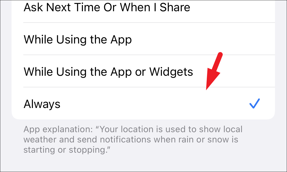 Finally, on the ‘Weather’ screen, tap on the ‘Always’ option present under the ‘Allow Location Access’ section to provide unrestricted access to location services.