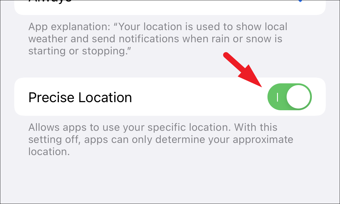 Then, on the same screen, locate the ‘Precise Location’ tile and tap on the following switch present on the far right edge of it to bring it to the ‘On’ position. This will allow the Weather app to use your exact location.
