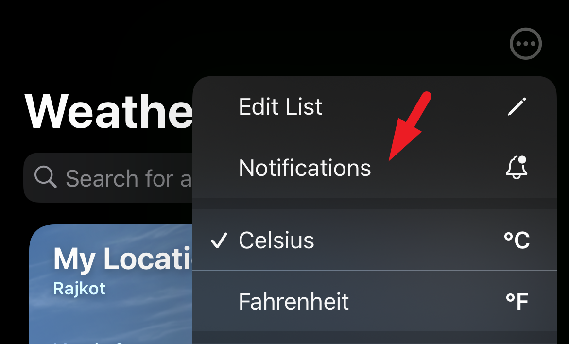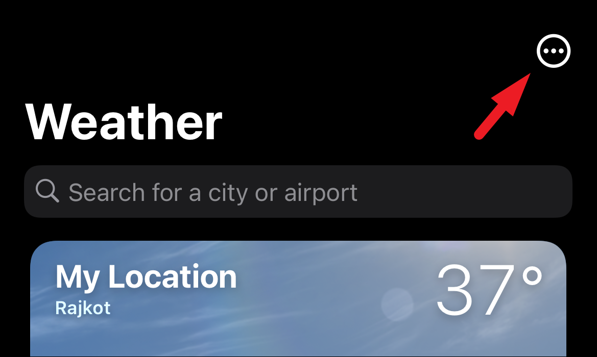 Then, on the ‘Weather’ app screen, tap on the ‘ellipsis’ (three horizontal dots) icon to reveal an overflow menu.