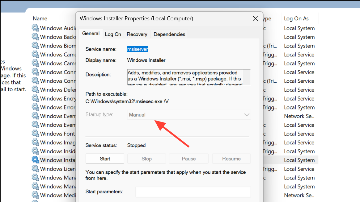 Step 2: Scroll through the list to locate Windows Installer. Double-click the entry to open its Properties window. Here, you can view the current status and configure how the service starts.