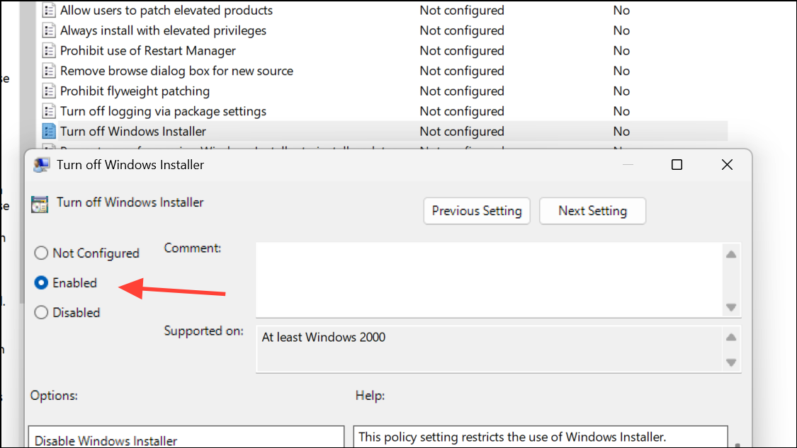 Step 3: On the right, double-click Turn off Windows Installer. To disable the service, set the policy to Enabled and select Always under Options. To re-enable, set the policy to Not Configured.