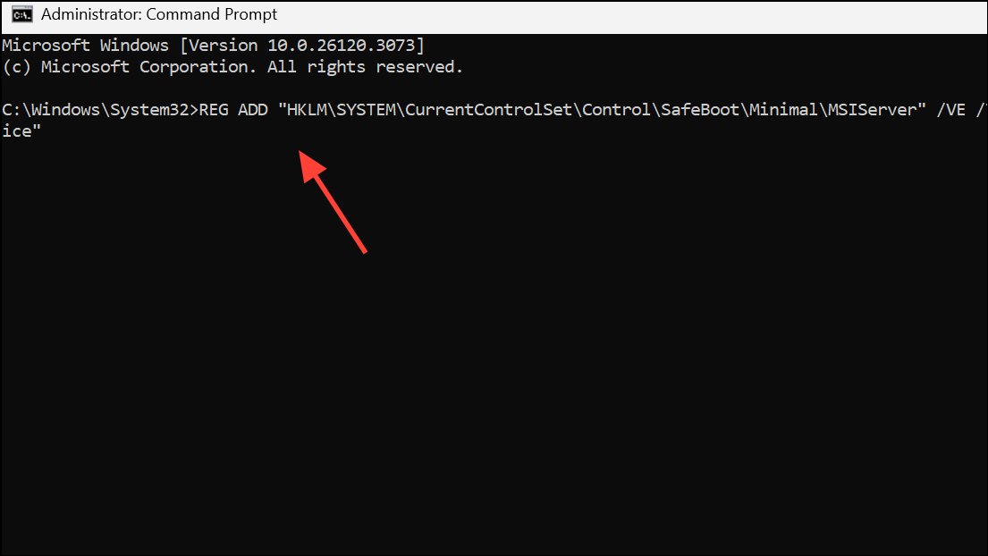 REG ADD "HKLM\SYSTEM\CurrentControlSet\Control\SafeBoot\Minimal\MSIServer" /VE /T REG_SZ /F /D "Service"