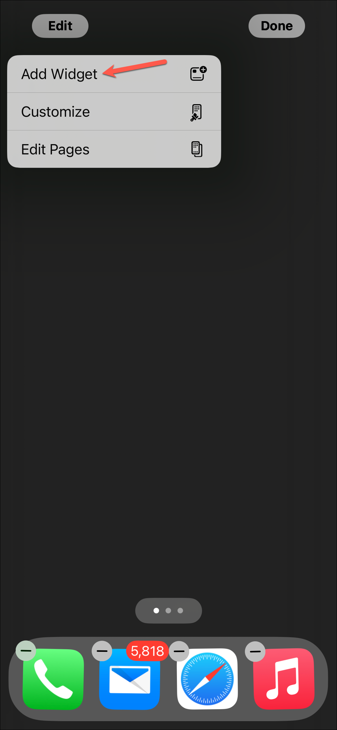- Once you've created the widget in the app, you go to your home screen, tap and hold it until you enter the jiggle mode, then tap on 'Edit' in the top-left corner. Select 'Add widget' from the options.