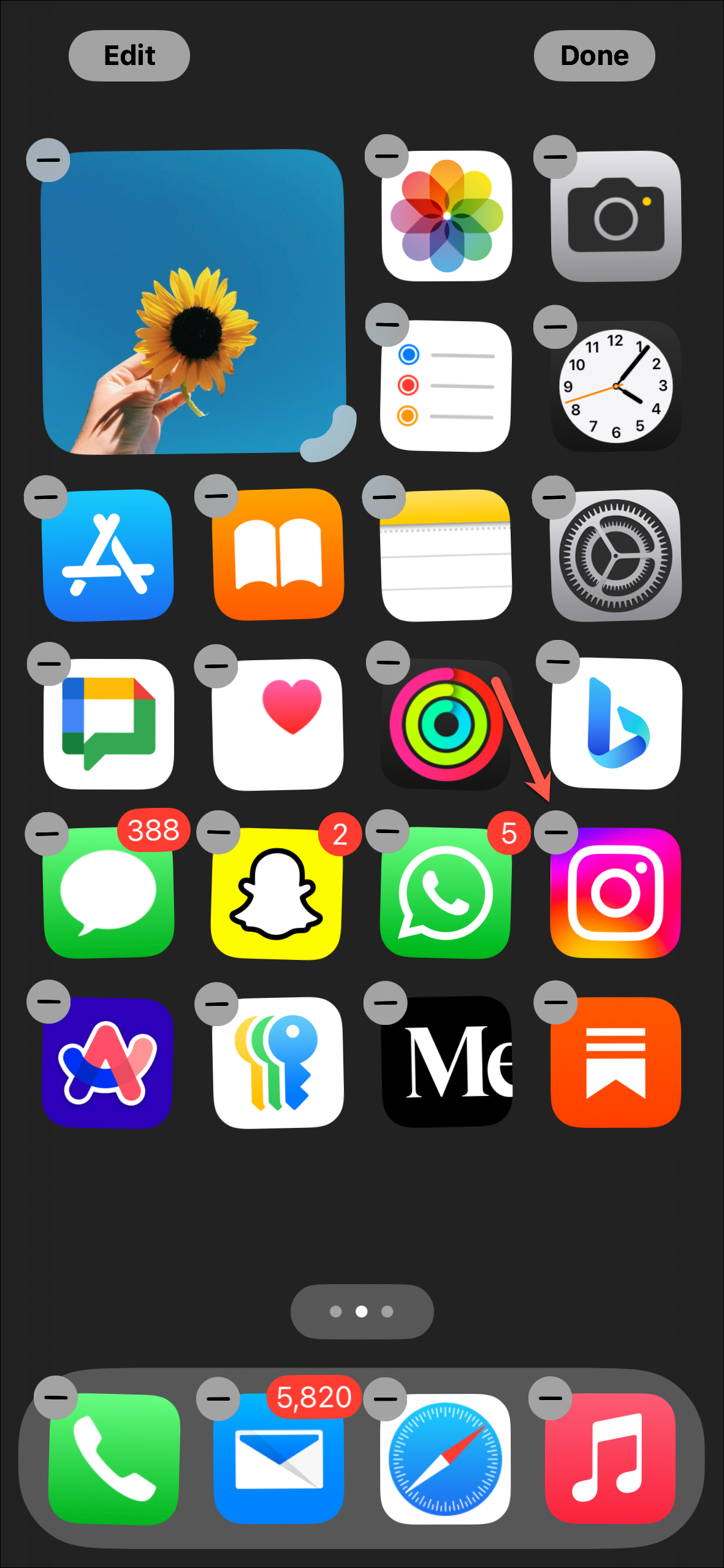 - An alternative is to deselect the entire pages so you don't have to spend time deleting each app and widget from your home screen. Tap the dots above the dock in the jiggle mode.