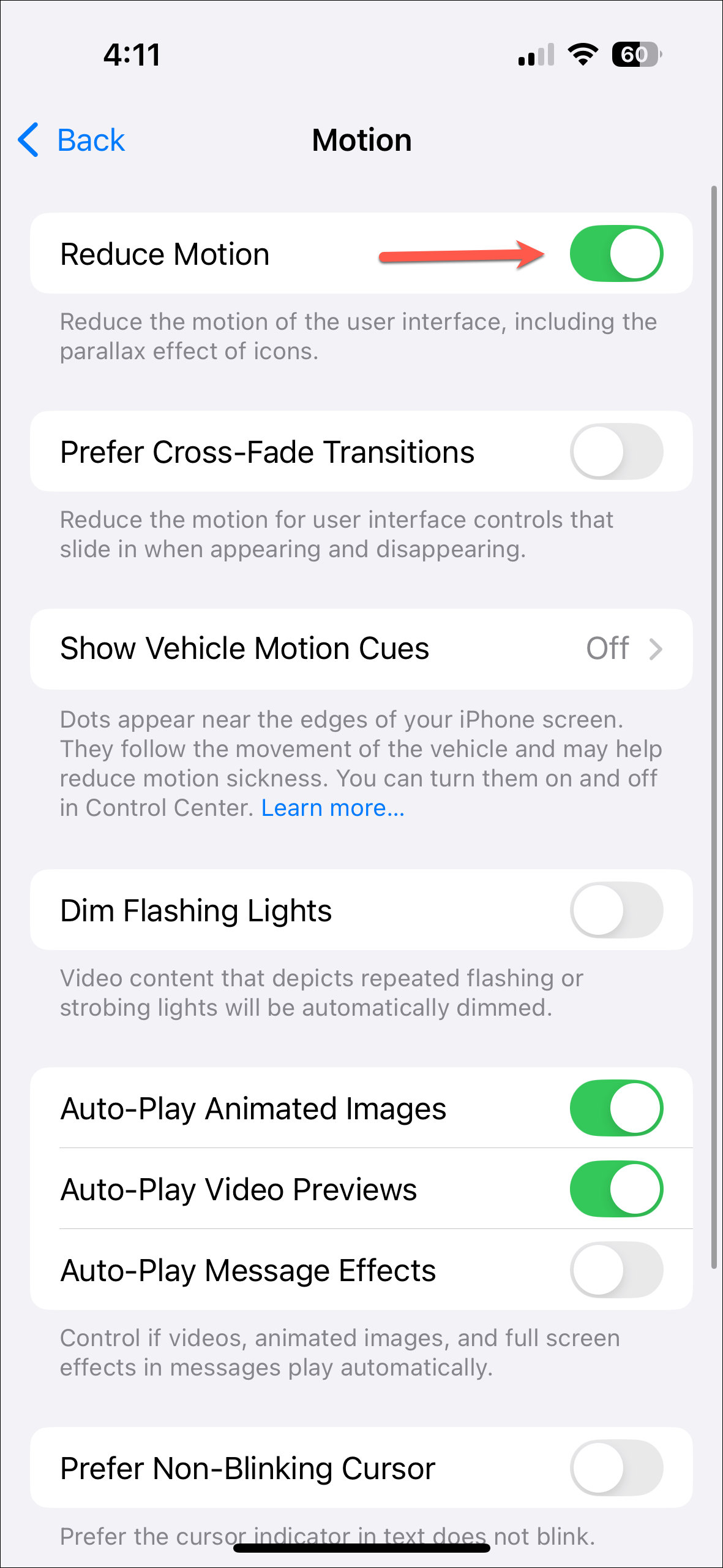 Settings>Accessibility>Motionand turn on the toggle for 'Reduce Motion'.