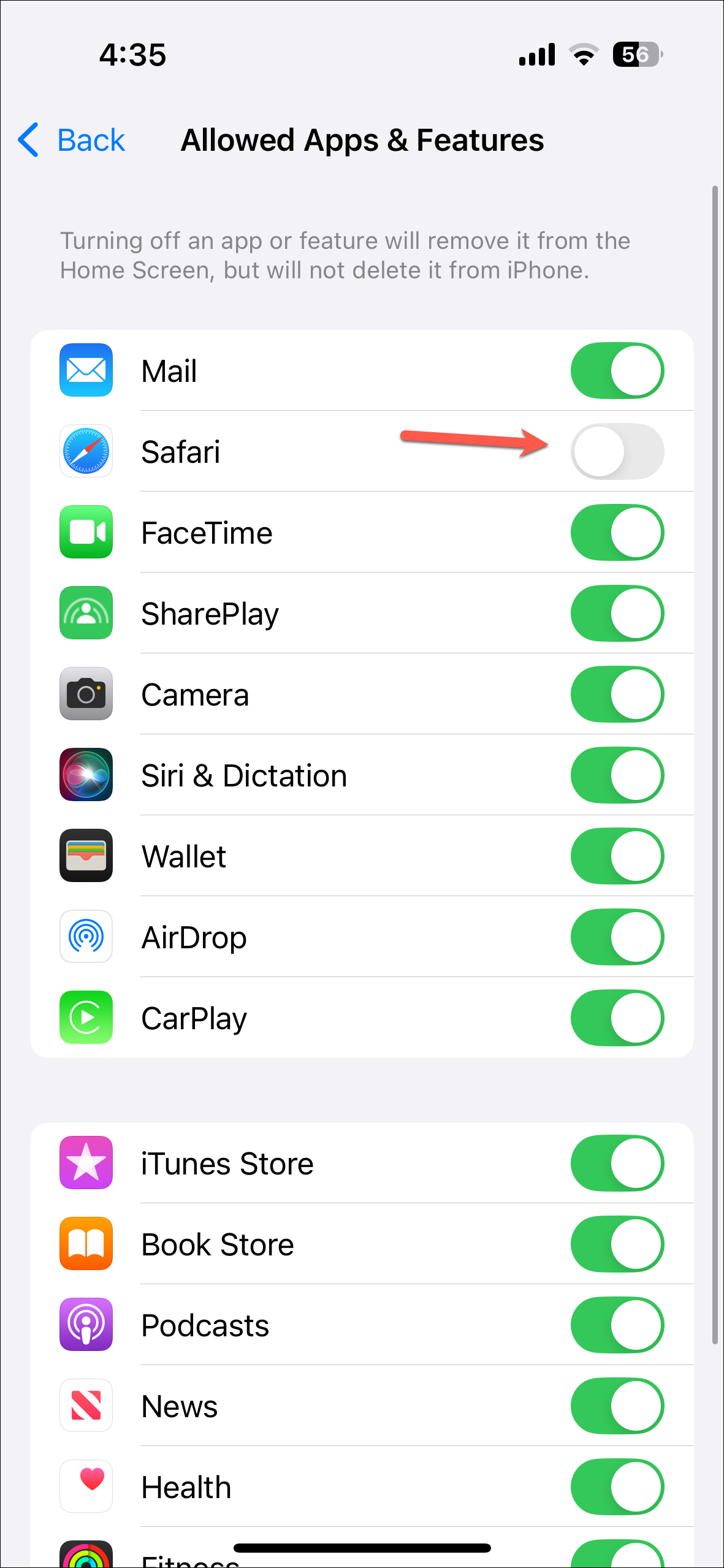 - Next, if you also want to limit your browsing, you can disable Safari. Go to 'Content & Privacy Restrictions'.
