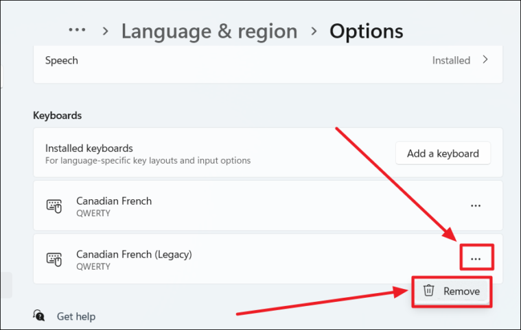 - Under the Keyboards section, find the keyboard you wish to remove, click the three dots next to it, and select Remove.