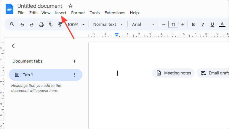 - Open a new or existing Google Docs document and click on the 'Insert' menu at the top.