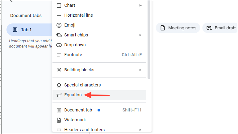 - Then click on 'Equation' in the dropdown menu that appears.