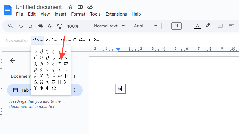 - Click on any of the equations in the toolbar to expand it and then you can select any symbol from the dropdown menu to insert it in the document.
