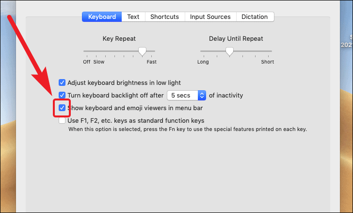 Now, click on the checkbox preceding the ‘Show keyboard and emoji viewer in menu bar’ option.