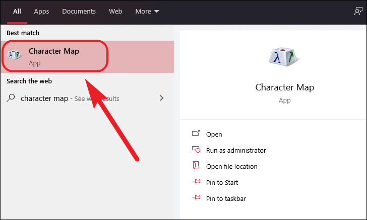 Now, click to open the ‘Character Map’ from the search results.