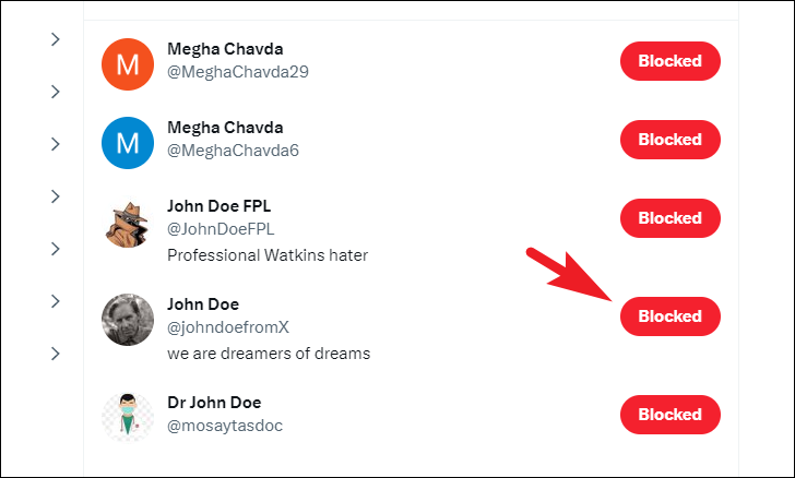 Now, you will be able to see all the accounts you have blocked. If you imported contacts from a previous account, they will be listed under the 'Imported' tab. Finally, click on the 'Block' button following the account you wish to unblock.