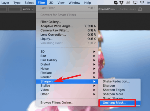 Go to the ‘Filter’ option on the menu bar and choose ‘Sharpen’ from the menu. Then select ‘Unsharp Mask’ from the submenu.