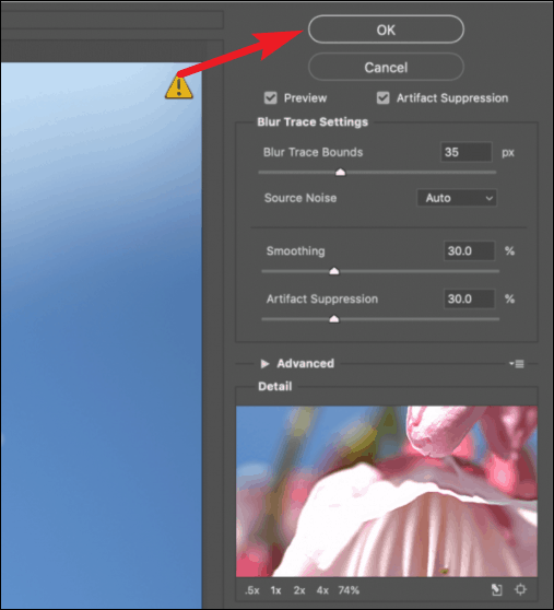 The Shake Reduction dialog box will open in the right panel, and the corrected image will appear there. If you’re satisfied with Photoshop’s automatic corrections, click ‘OK’. Or, adjust the sliders to make changes yourself and then click OK.