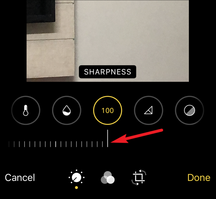 Once Sharpness is selected, swipe right on the scale below and keep swiping until the image is unblurred. Then, tap ‘Done’ to save the changes.