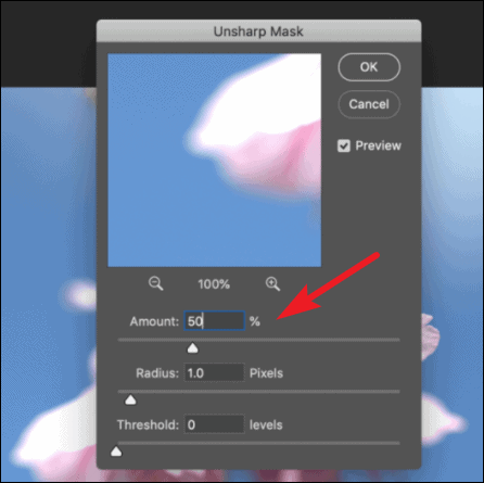 A dialog box for ‘Unsharp Mask’ will open. Adjust the sliders to the values where you are satisfied with the result. Preview the image before applying the changes. Then, click ‘OK’.