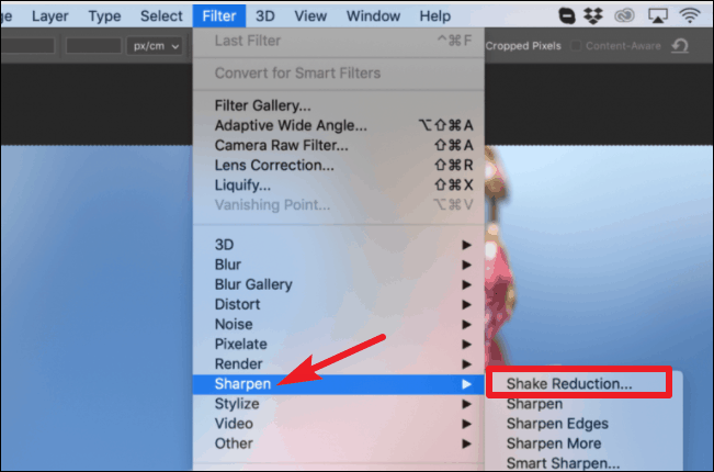 Open the Filter menu, go to the ‘Sharpen’ option and select ‘Shake Reduction’ from the sub-menu.