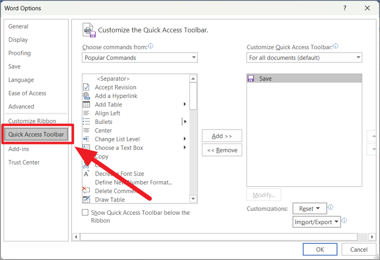 Step 2: In the Word Options dialog box, choose 'Quick Access Toolbar' from the left sidebar.