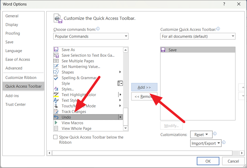 Step 4: Scroll through the list to find 'Undo'. Select it and click the 'Add >>' button to include it in the Quick Access Toolbar.